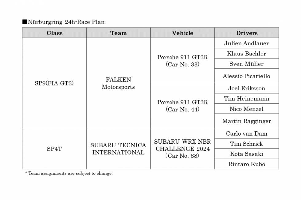 *1 FALKEN Announces Driver Line-up for Nürburgring 24h-Race and Wins Overall Victory in Nürburgring Endurance Series (News Release Issued on April 12, 2024) https://www.srigroup.co.jp/english/newsrelease/2024/sri/2024_030.html